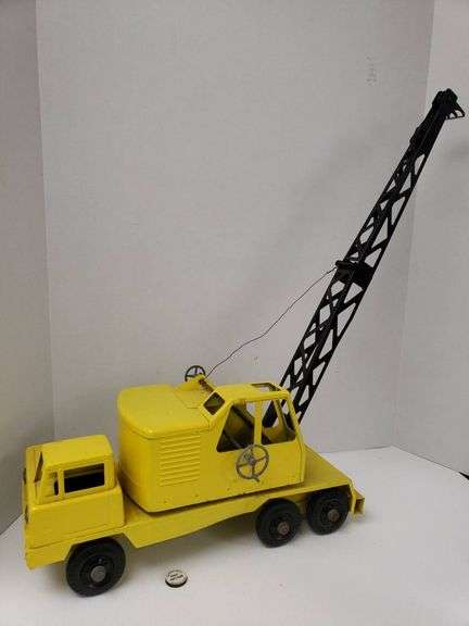 Yellow tin toy truck featuring a black metal boom, rotating cab, and a detailed exterior with operational wheels. Includes a string attached to the crane's lifting arm. Distinct cabin and ladder details.
