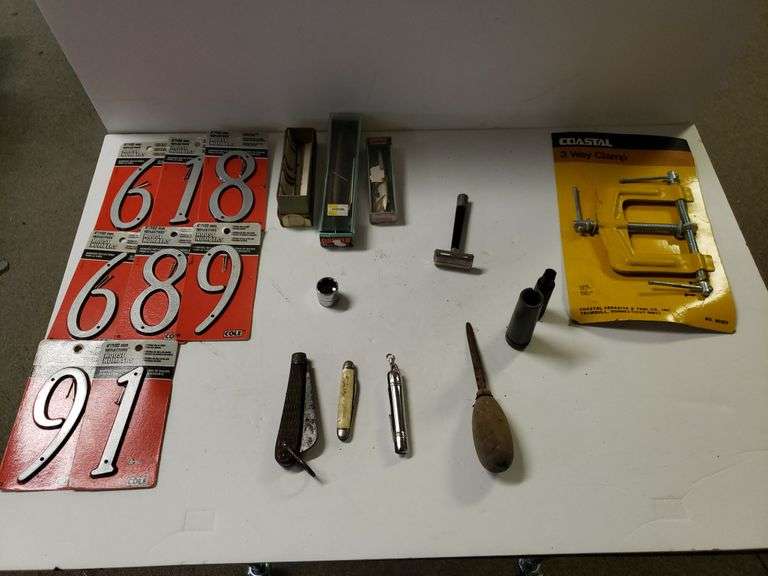 LOT 3247 - House Numbers, 3 Way Clamp, Pocket Knives, And More