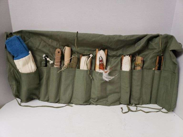 Green fabric roll-up organizer containing various outdoor utility items, including fishing line spools, hooks, nets, and utility tools. Multiple designated storage slots secured with ties for easy transport or access.