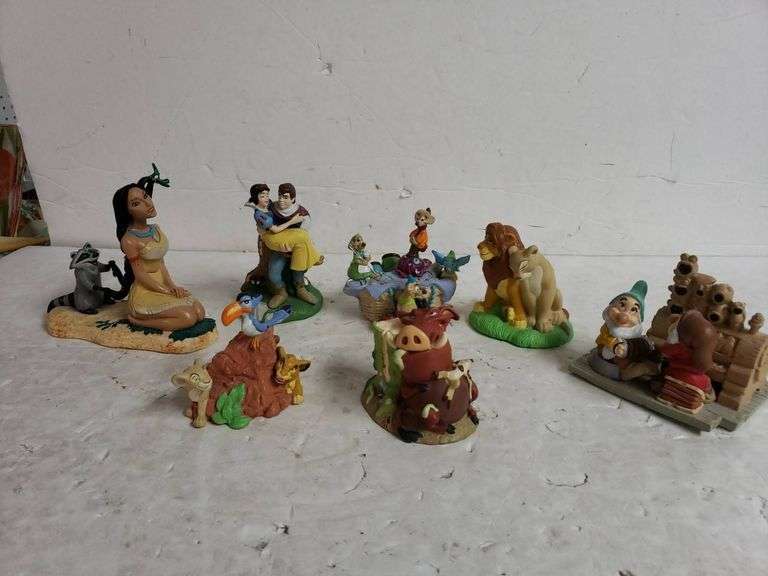 Set of Disney-themed character figurines showcasing scenes from popular movies such as Pocahontas, Snow White, The Lion King, The Little Mermaid, and others. Detailed painted depictions of characters including animals and props from iconic scenes.