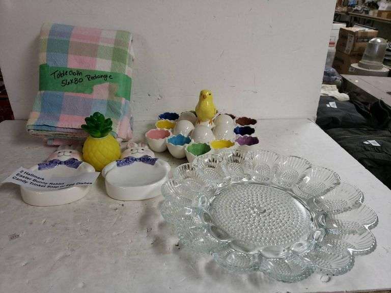 Collection includes a pastel rectangular tablecloth (56x80), a clear decorative plate, a ceramic chick egg holder, two Hallmark bunny dishes, and a ceramic pineapple. Great for themed settings.