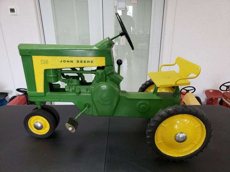 Green and yellow pedal tractor marked as Model 130 and John Deere. Features a front grill, steering wheel, and yellow seat. Chain drive mechanism with yellow metal wheels and rubber tires.