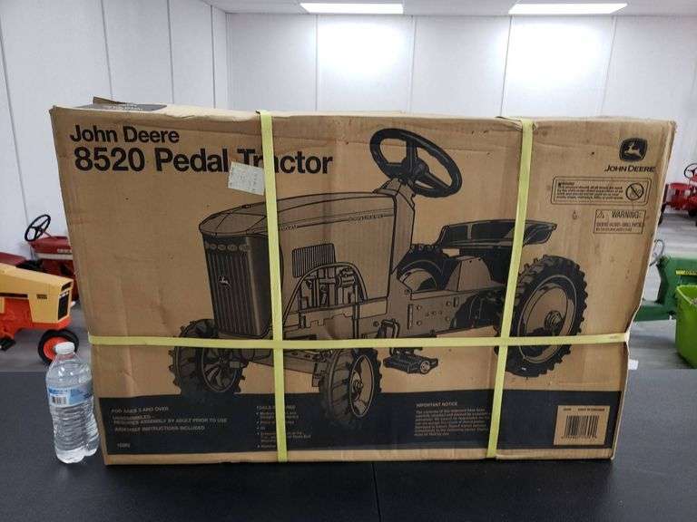 John Deere 8520 pedal tractor by Ertl, packaged in its original box. Designed for ages 3 and over, requires adult assembly, with instructions included. Licensed John Deere product, dated 2002.