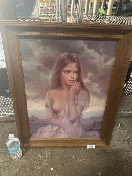 Framed artwork signed by Vincià€ta features an image of a woman sitting in thought against a cloudy background with subtle landscape details in the distance. The piece is displayed in a rectangular frame.