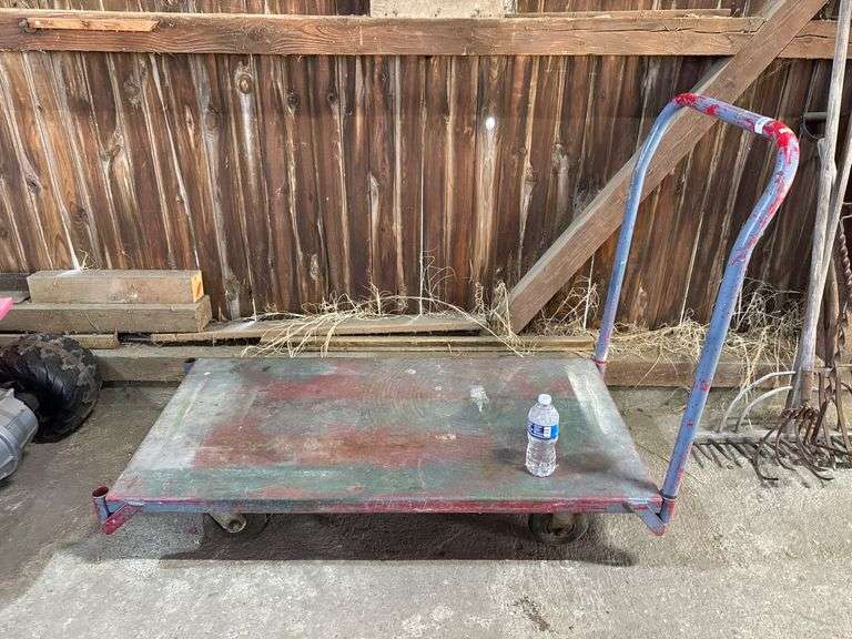 Metal push cart featuring a flatbed design, handle for maneuvering, and four wheels. Constructed for utility purposes, suitable for various hauling needs. Handle and wheels facilitate movement.