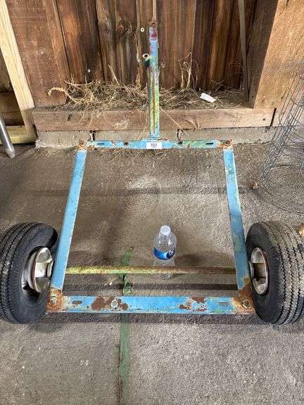 Metal frame featuring two pneumatic tires with a central tow hook up. Suitable for various transportation or utility purposes. Overall construction includes bolts and joints for assembly.