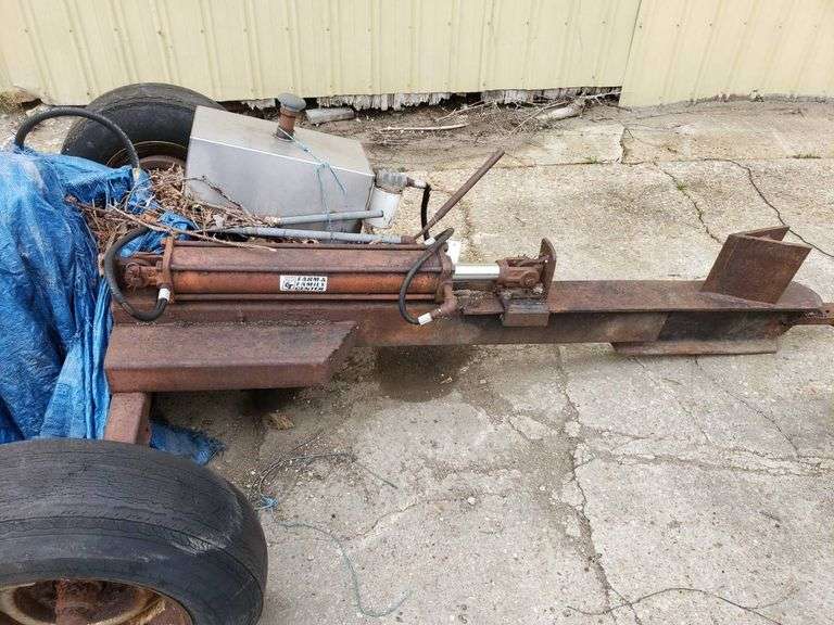 Hydraulic log splitter featuring a mounted engine, hydraulic components, and wheels for mobility. Includes a metal tank and a long beam for splitting tasks.