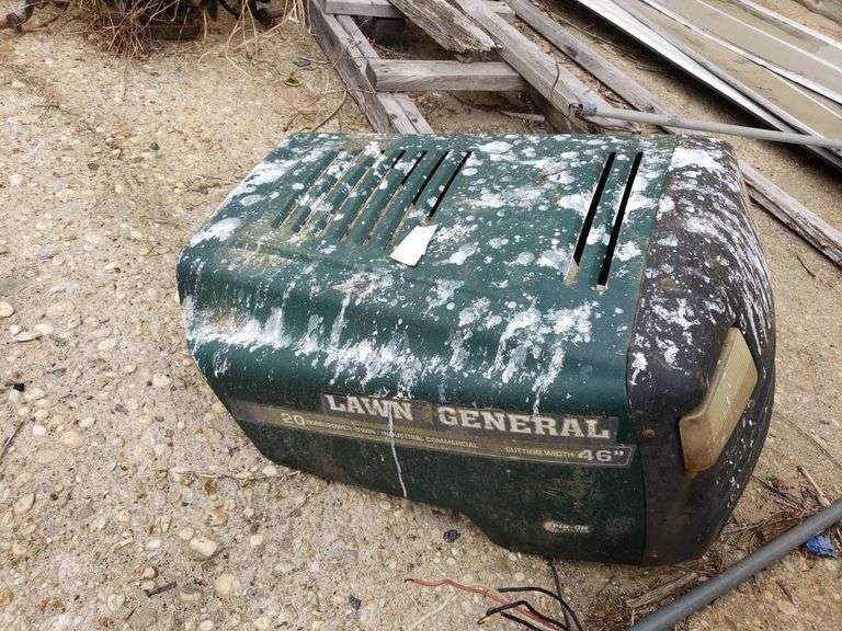 Green Lawn General mower cover labeled for a 46-inch mower with 20 HP designation. Features vent slots on top and sides, as well as light panel placements. Designed for outdoor mower protection.
