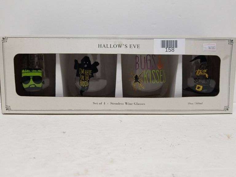 Set of 4 Hallow's Five stemless wine glasses featuring Halloween-themed designs, including phrases and graphics. Comes in original packaging.