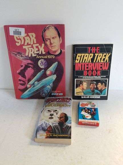 Set includes four items: 1979 Star Trek Annual, The Star Trek Interview Book by Allan Asherman, a Star Trek-themed paperback novel by J.A. DeCandido, and a Star Trek-themed playing card deck.