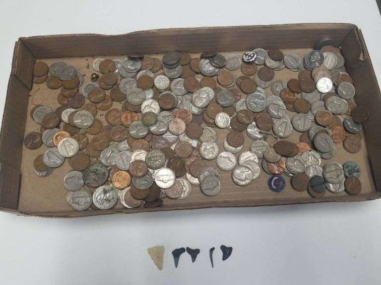 Assortment including pennies, nickels, dimes, sharks teeth, and pins. Items are displayed in a box, featuring a variety of coins and multiple shark tooth specimens.