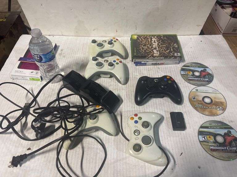 Lot includes Xbox controllers, assorted games for Xbox and PS4, MetroPCS Alcatel Fierce 4 phone case, charging dock, and various cables.