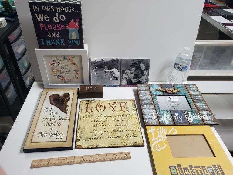 Collection of decorative signs, photo frames, and plaques featuring inspirational quotes, family themes, and motivational phrases. Includes wall-hanging and tabletop pieces.