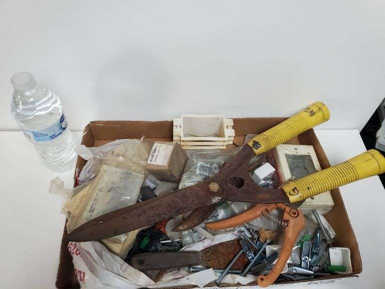 Assorted lot including rusted shears with yellow handles, screws, metal clamps, and various hardware items. The lot also contains plastic and metal components, packed in a box.