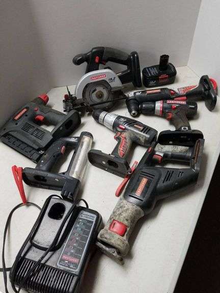 Lot includes a variety of Craftsman cordless power tools powered by 19.2V batteries. Items include drills, saws, lights, and chargers, as well as DieHard batteries. Tools are stored together in a convenient basket for easy transport.