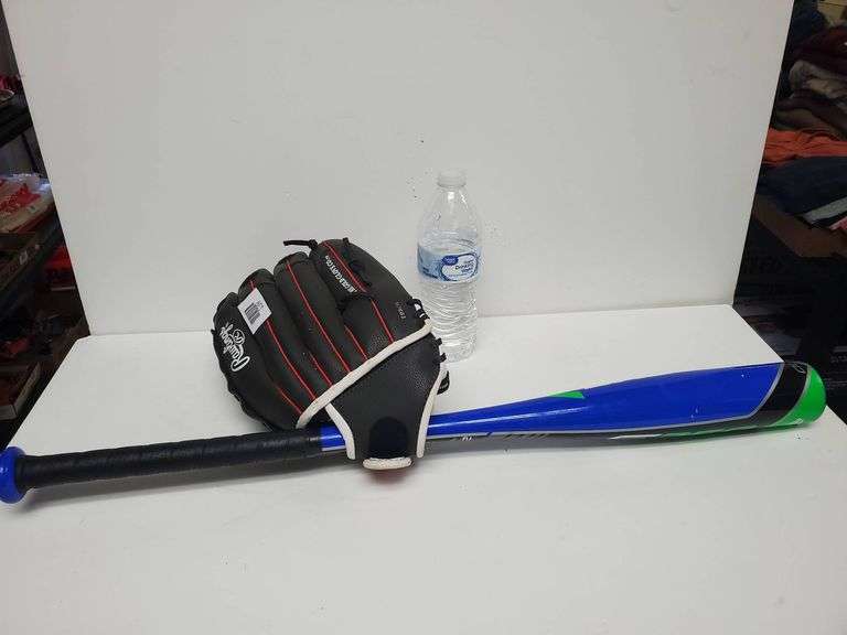 Easton 27-inch baseball bat with a Rawlings baseball glove. The glove features black and red accents, while the bat comes in a blue and green design.