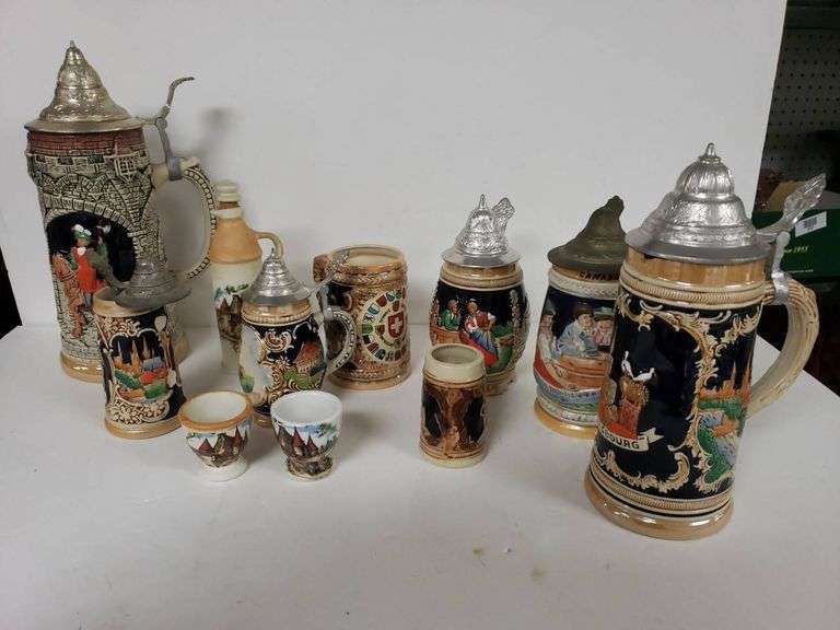 A collection of detailed beer steins and decorative cups with various intricate designs and scenes. The collection includes pieces with lids and a range of styles. Some have chips.