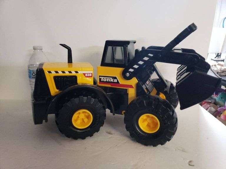 Tonka construction vehicle toy with model number 838 featuring black and yellow coloring, movable loader arm, and detailed branding. Plastic construction with large rugged wheels, designed for play or collection purposes.