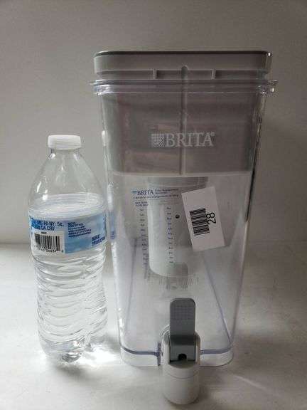 Brita water filtration dispenser featuring a spigot for easy dispensing and a measuring guide on the side. Compact design suitable for household or office use.