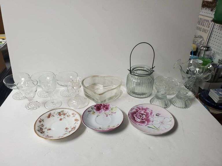 Collection features various glassware including stemware, a heart-shaped dish, and a handled jar. Also includes decorative plates with floral motifs, one marked Made in Japan on the underside.