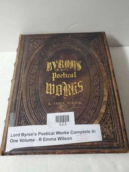 A bound edition of Lord Byron's poetical works, compiled by R. Emma Wilson. The book features a decorative cover with gold lettering and includes illustrations.
