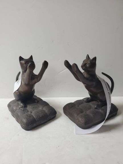 Bronze bookends featuring cat figures on textured cushions. Manufactured in the 1970s. Designed to serve both functional and decorative purposes.