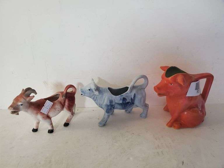 Ceramic creamers featuring three distinct animal shapes, including a pig, a goat, and a cow. Each creamer has a pour spout design incorporated into the sculpture, with varying colors and details.