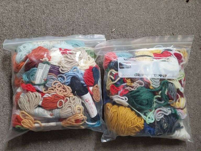 Two resealable bags containing assorted yarn pieces in a variety of colors suitable for crafts or knitting projects. Each bag contains multiple yarn types and colors.