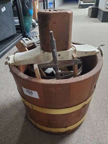 Sterling Electric Ice Cream Freezer with a 5-quart capacity. Includes visible metal components, electric motor cover, and labeled bucket assembly. Designed for making ice cream.