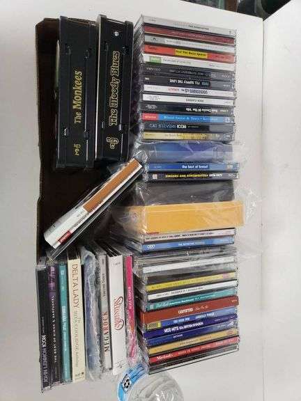 Music CDs including albums by Toto, The Moody Blues, and The Monkees. Contains compilation CDs such as Rock Classics of the '60s and titles across multiple genres. Includes multi-disc sets and individual cases.