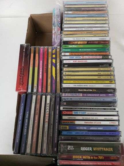 Sealed music CDs showcasing various artists and genres, including compilations, greatest hits, and complete albums. Titles include Buffalo Springfield, The Hollies, Bread, Roger Whittaker, and more for a diverse selection.