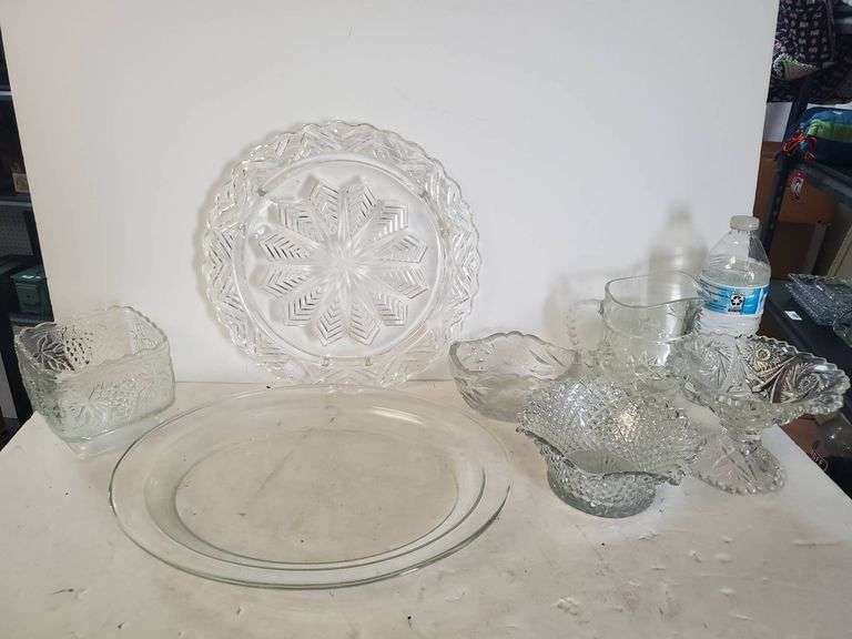 Clear glass tableware featuring a variety of items, including plates, bowls, and other serving pieces with decorative designs.