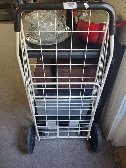 Metal utility cart featuring a spacious wire basket, black handle, and four sturdy rolling wheels. Designed for versatile use for transporting or storage needs.