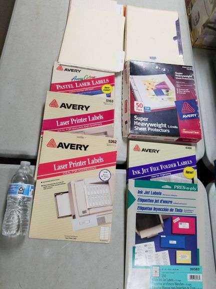 Avery office supplies include laser and inkjet labels, sheet protectors, and file folders. Includes pastel and address labels, laser printer labels, heavyweight sheet protectors, and manila folders.
