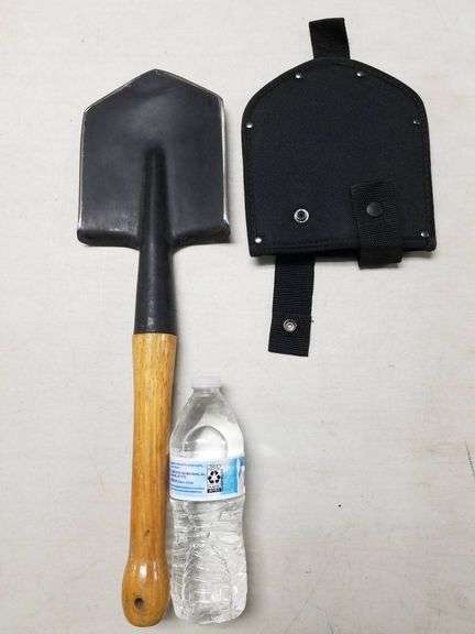 Cold Steel shovel with a metal blade, wooden handle, and included black sheath. Compact design ideal for various tasks. The sheath features snap-button closures for secure storage and carry.
