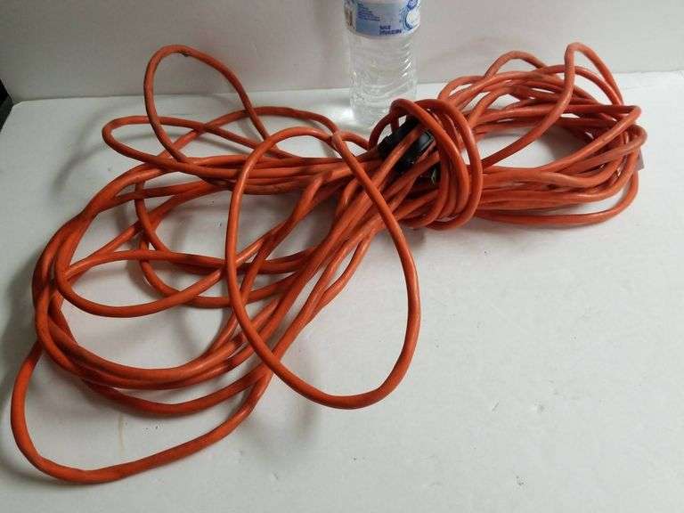 Orange extension cord with plug connectors suitable for various electrical applications. The cord is coiled and features a black attachment near the connectors.