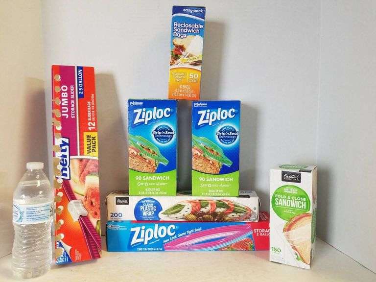 Bundle includes Ziploc sandwich bags, Essential Everyday fold & close sandwich bags, Easy Pack reclosable sandwich bags, clear plastic wrap, and Hefty jumbo slider bags. All items are new and unopened except for the jumbo bags.