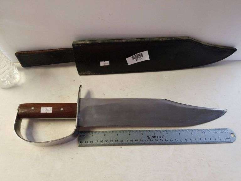 Knife with a metal blade, a guarded handle featuring a wood grip, and a protective sheath. Marked 'India' on the blade. Approximate length of the blade is shown with a ruler.