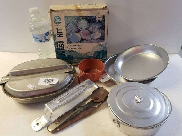 Northwest Territory mess kit composed of aluminum items including a fry pan, pot with cover, dish, and polypropylene cup. Includes the original packaging for reference.