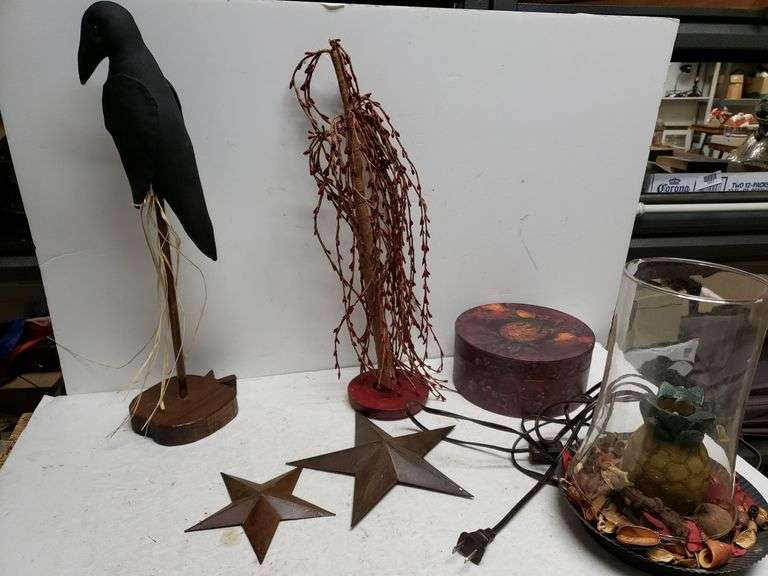 LOT 742 - Decorative Black Bird, Red Tree, Stars, Gift Box, Light Up Potpourri Pineapple (not working)