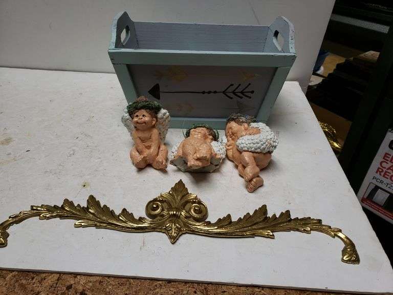 LOT 771 - Blue Wooden Crate, Baby Angel Figures, Gold Emblem Wall Decor