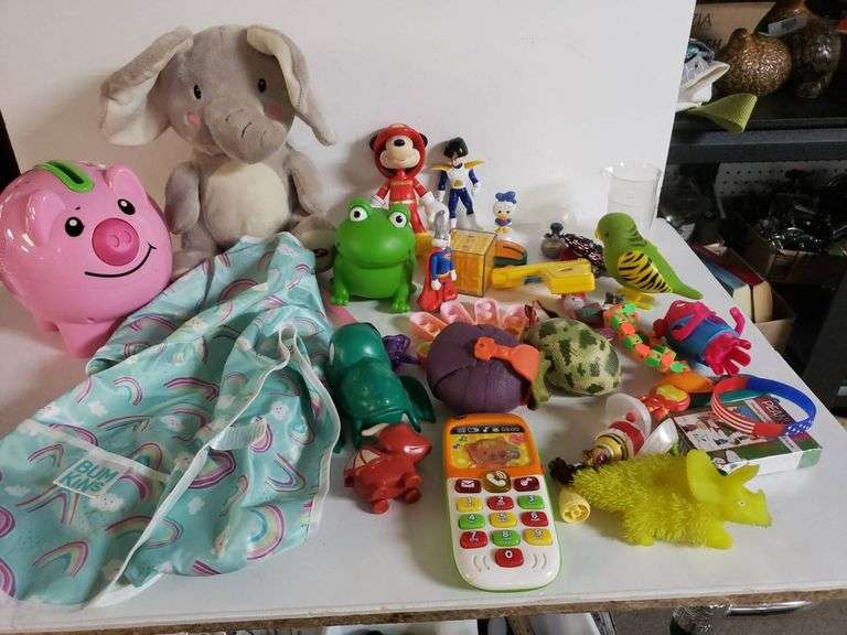 An assortment of children's toys such as a piggy bank, plush elephant, action figures, toy phone, animals, and other interactive play items. Various themes and designs are represented.