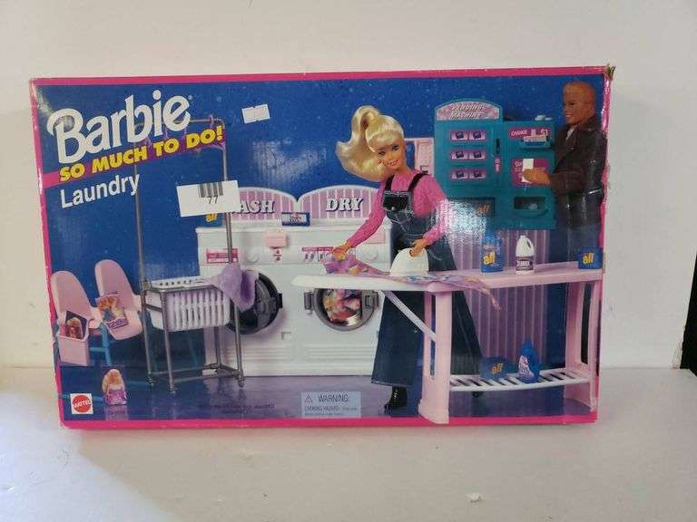 Mattel Barbie So Much To Do Laundry playset featuring a washing machine, dryer, ironing station, and accessories. The set depicts Barbie completing tasks in a laundry setting.