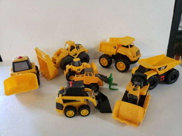 Construction vehicles featuring the CAT logo. Includes multiple types of construction equipment, such as front loaders, bulldozers, and dump trucks. Plastic materials with functional designs.