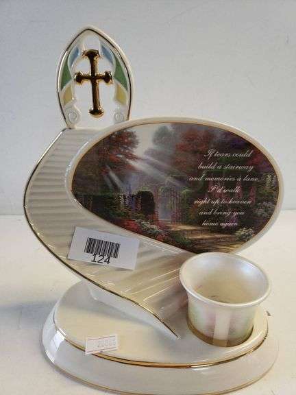 Ceramic memorial figurine featuring a cross, foliage scene, and an inscription reading 'If tears could build a stairway...' Includes a small holder for a votive candle.