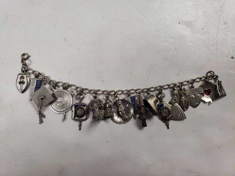 Sterling silver bracelet adorned with multiple charms, each marked sterling. Includes a variety of motifs such as enameled shields, religious figures, and a graduation cap, showcasing detailed craftsmanship.