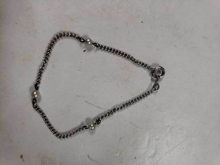 Sterling silver chain bracelet featuring pearl accents and a spring ring clasp. Compact and lightweight design suitable for everyday wear or special occasions.