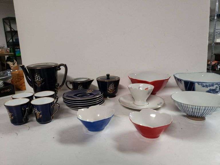 Ceramic pieces, featuring a navy tea set with ship motifs, small bowls in red, blue, and floral patterns, and additional plates and accessories. Includes various designs and styles.