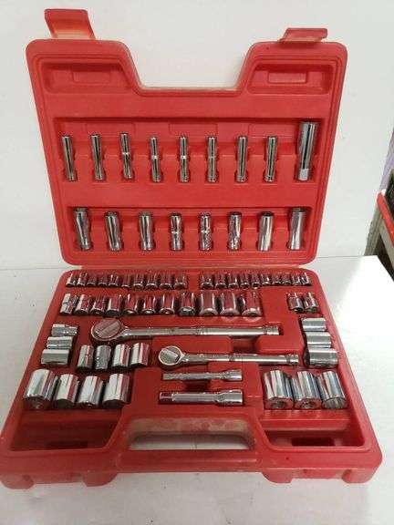 Comprehensive set of sockets and ratchet tools in a red hard-shell Technician case. Includes various socket sizes and attachments organized in a molded interior.