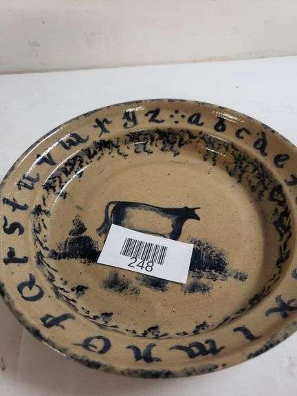 Round ceramic plate featuring a cow illustration at the center, bordered by the alphabet, signed by Becky Mummert and dated 1996 on the underside. Measures approximately 7.5 inches in diameter.